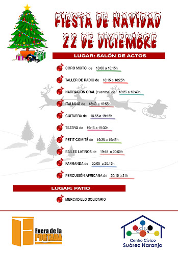 El próximo 22 de diciembre queremos compartir nuestra fiesta de Navidad con muestras de lo realizado en estos meses en nuestros talleres, tambien se realizará en el mismo dia un Mercadillo Solidario. Les esperamos!